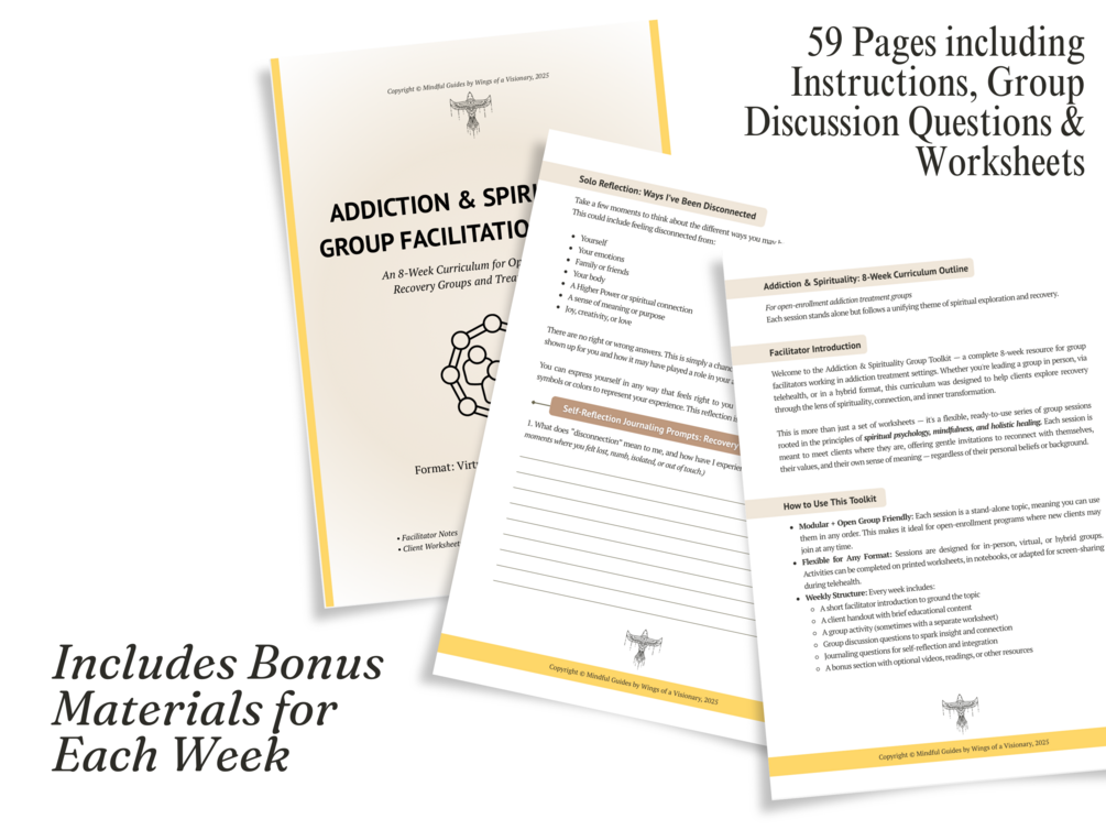 Designed for clinicians, counselors, and facilitators working in addiction treatment, this 8-week curriculum explores recovery through the lens of spirituality, connection, and inner transformation — no matter your clients’ beliefs or background.